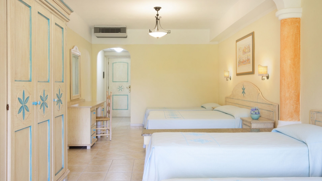 DESCRIZIONE E SERVIZI: Il Club Hotel Marina Beach è una costruzione a corpo unico, a schema aperto, in stile moresco, articolata su tre piani, rivolta sul parco piscine, dove sono inserite le camere centrali del Resort, il ricevimento, il ristorante, il centro congressi e il bar portico, vicino al quale sorgono, tra gli altri, il teatro, il parco giochi e il corpo camere Marina Garden, distante 200 m. Alcuni bilocali Family, distaccati dal Club Hotel Marina Beach e adiacenti il Marina Garden, offrono una soluzione adatta alle famiglie, con un servizio e due ambienti Le camere sono tutte indistintamente arredate in tipico stile sardo dai colori panna e turchese e si distinguono in camere Doppie, Triple, Quadruple (con letto a castello nel Marina Garden), Quintuple (nel corpo principale) composte da letto matrimoniale più 3 letti aggiunti e Bilocali (solo nel corpo Marina Garden). Sono dotate di veranda coperta attrezzata, servizi privati con asciugacapelli, telefono, aria condizionata e riscaldamento, TV LCD, minibar (consumazioni a pagamento) e cassetta di sicurezza elettronica.
